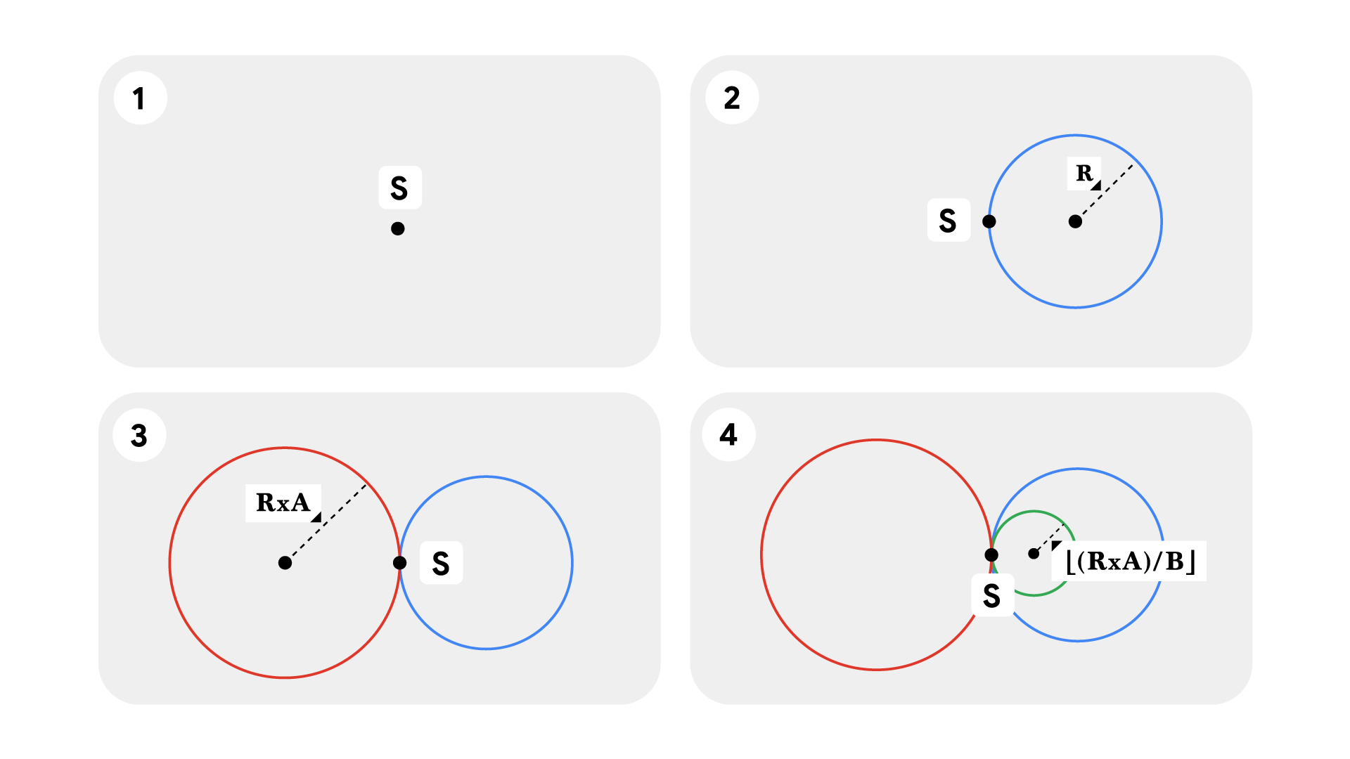 Bạn được cho ba số nguyên ~R~, ~A~, ~B~. Bạn hiện đang ở tại tâm của vô cực. Trước tiên, bạn sẽ bắt đầu vẽ hình tròn bên phải với bán kính ~R~ và sau đó quay trở lại tâm của vô cực. Kế tiếp, bạn bắt đầu vẽ hình tròn bên trái với bán kính bằng bán kính của hình tròn trước đó nhân với ~A~. Sau khi đến tâm của vô cực, bạn lại bắt đầu vẽ hình tròn bên phải với bán kính bằng bán kính của hình tròn trước đó chia cho ~B~. Sau khi đến tâm của vô cực, bạn lại vẽ hình tròn bên trái với bán kính bằng bán kính của hình tròn trước đó nhân với ~A~.